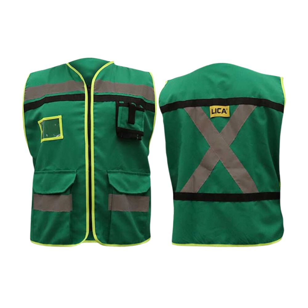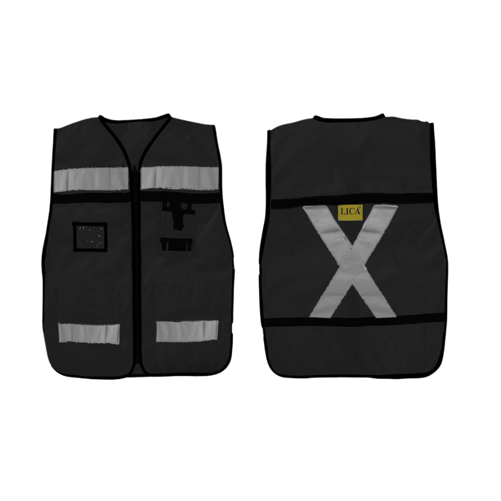 Reflejante gris de 2” de ancho en frente y espalda. Zipper delantero.